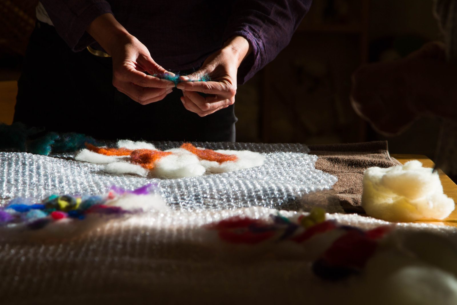 Plongez les mains dans l'eau savonneuse et frottez la laine pour la feutrer et la transformer en balle colorée, puis fabriquez votre porte-clef souvenir.