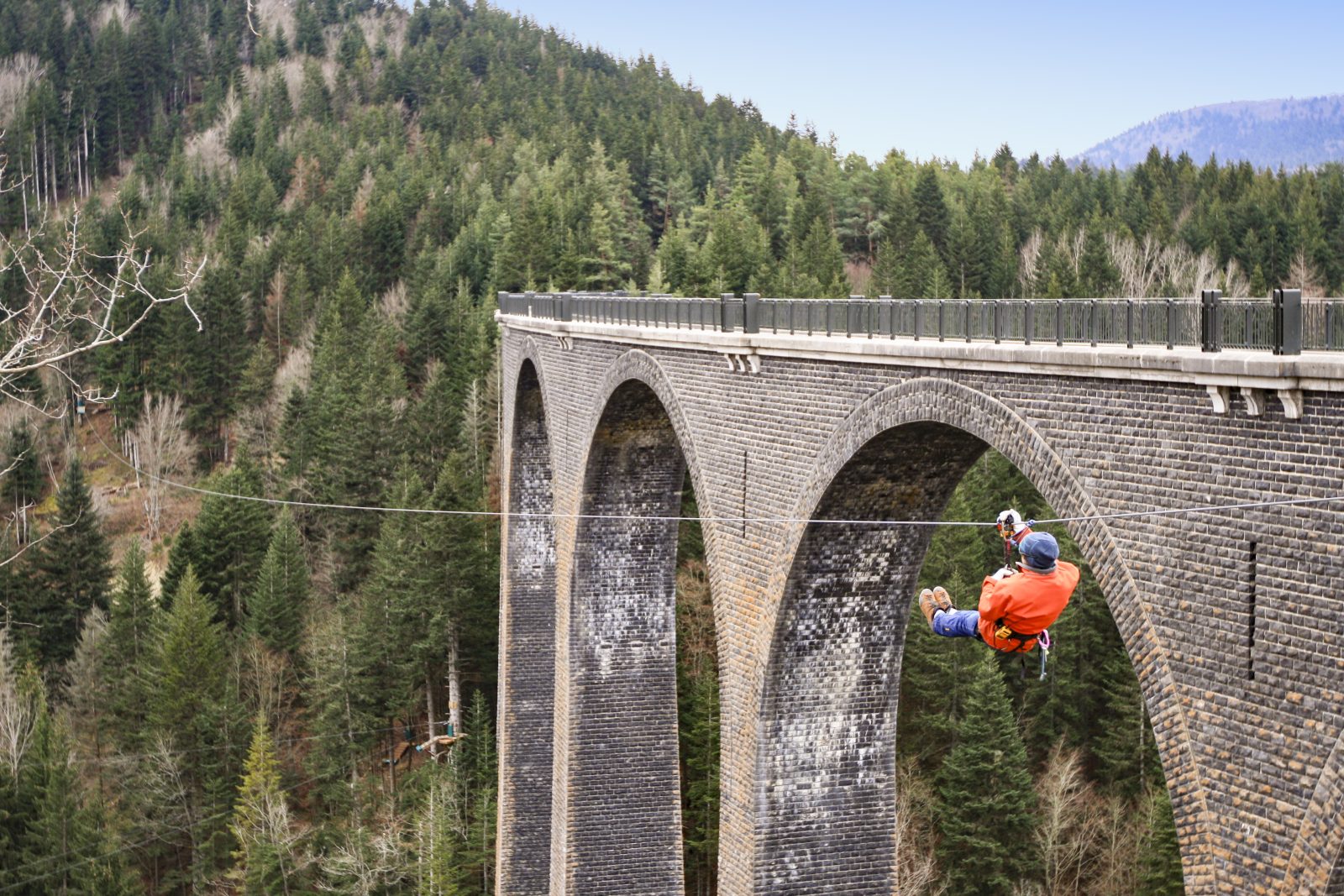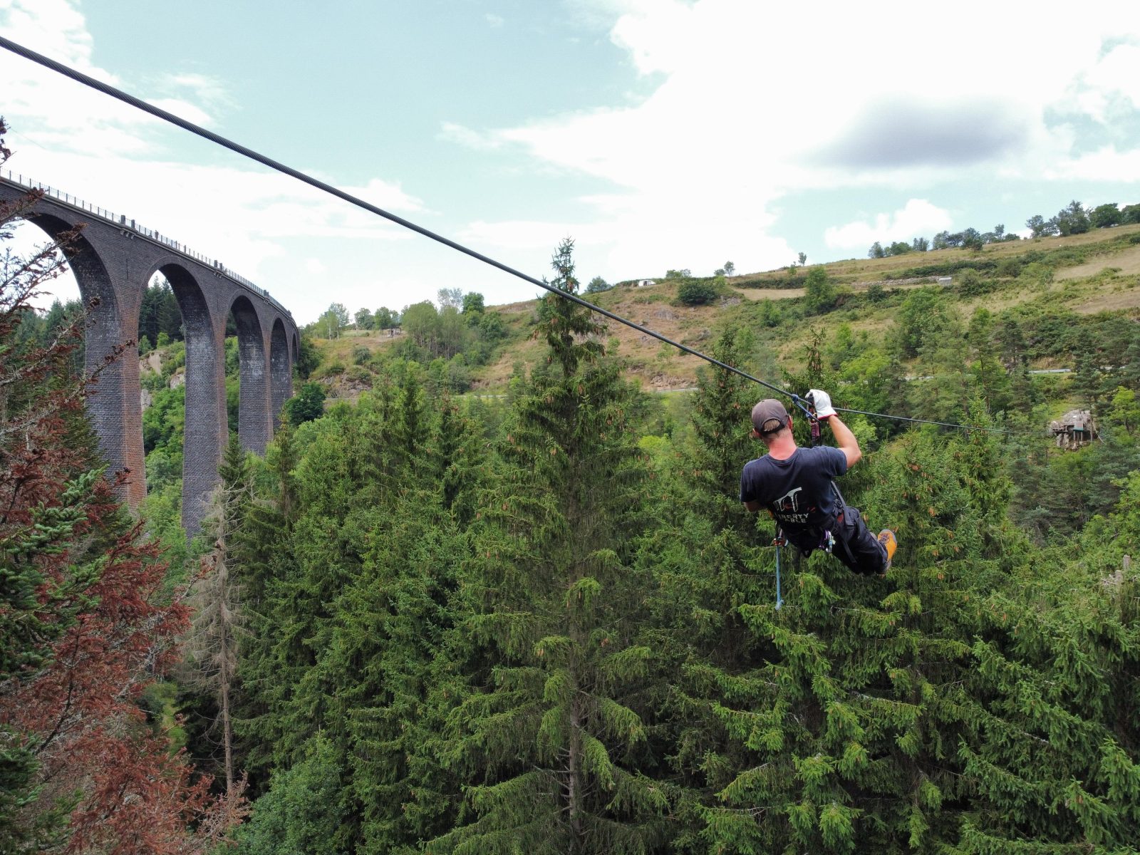 Parcours de tyroliennes géantes, à quelques mètres du Viaduc de la Recoumène, et au dessus de la rivière de la Gazeille.