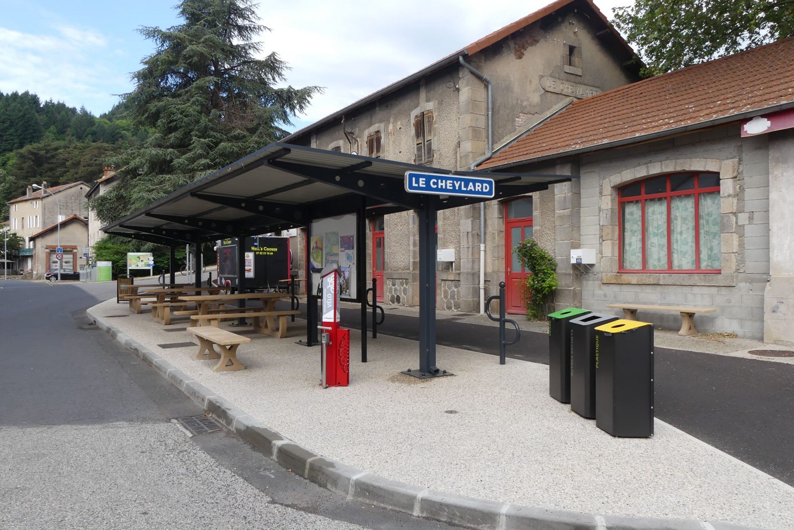 Tables, poubelles, stationnement vélos, borne de réparation et de gonflage pour vélos et casiers de recharge VAE.
