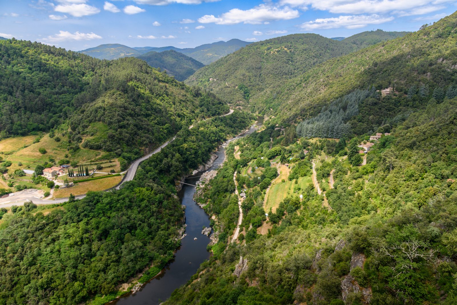 Les points de vue sur l'Eyrieux se multiplient et permettent de belles pauses contemplatives. En contrebas de la voie verte, les eaux tranquilles de la rivière invitent à la halte. Pont-de-Chervil est un lieu idéal pour un moment rafraîchissant à mi-chemin de l'étape. On s'immisce de plus en plus dans les gorges de l'Eyrieux, au coeur d'un environnement qui étincelle de vert et d'orange à l'automne, car ici le châtaignier est roi.