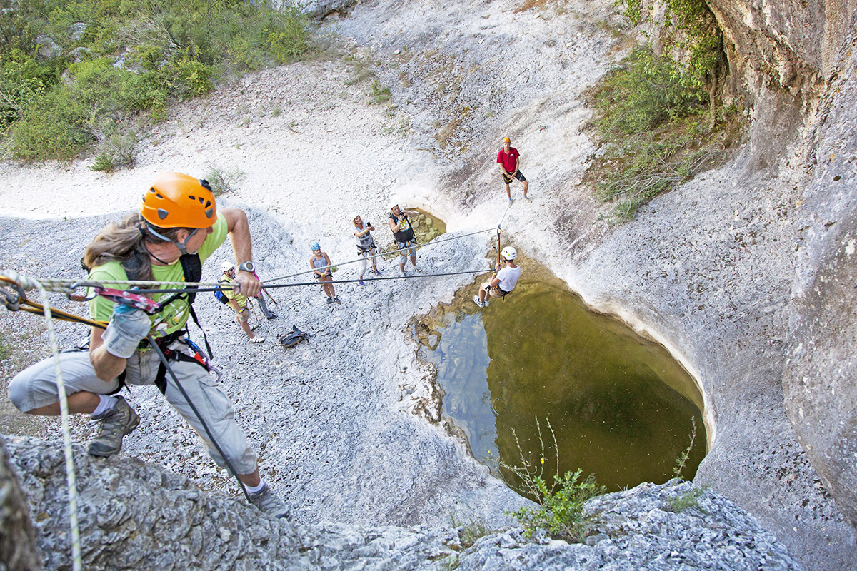 Unique en Ardèche, vous parcourrez le magnifique canyon sec du Vendoule. 2 tyroliennes (10 et 15m) puis une marche esthétique qui mène à la dernière grande tyrolienne (30 m) qui atterrit au pied de la cascade de Rochecolombe. Dès 5 ans (harnais spéciaux).