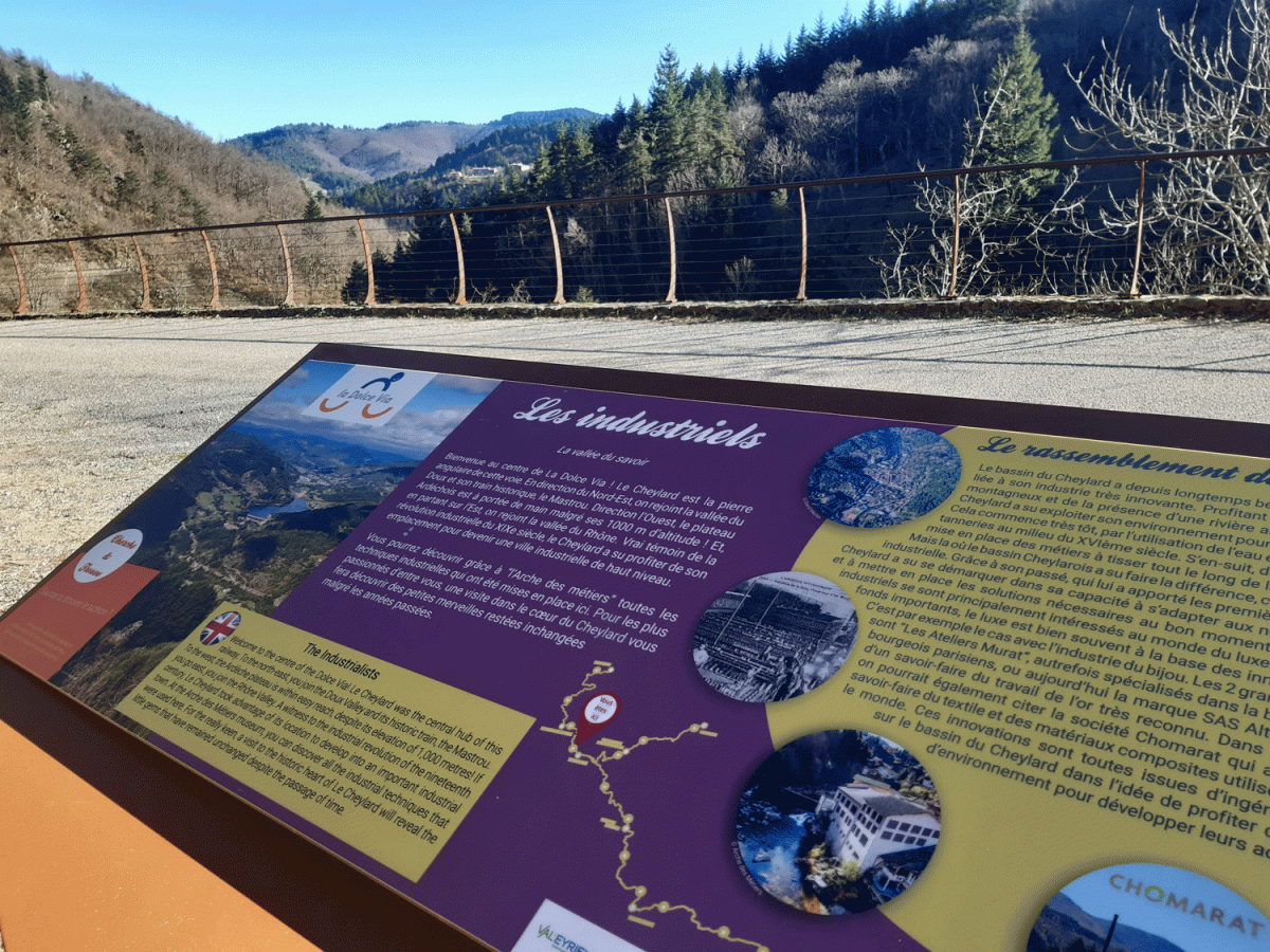 Quatorze panneaux d’interprétation ont été posés le long de La Dolce Via : deux sur le territoire de Lamastre, six sur le territoire de Val’Eyrieux et six sur le territoire de Privas.
