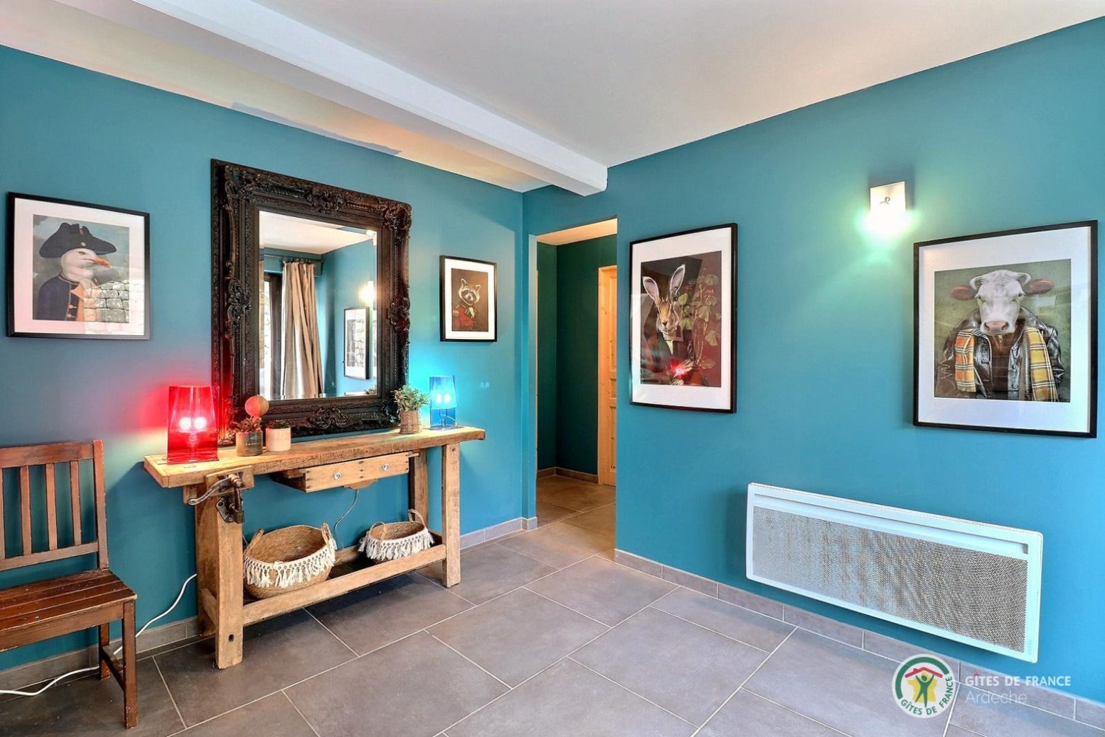 L'intérieur du gîte est tout aussi plaisant grâce à des pièces spacieuses, lumineuses et une décoration recherchée. Au niveau principal (4 marches depuis le hall d'entrée), un agréable salon a été aménagé avec canapés, bibliothèque, TV et cheminée à insert. Observez une des caves grâce au plancher vitré présent dans la pièce. La cuisine est séparée et entièrement équipée, on y retrouve un grand îlot central ainsi qu'une table pour se réunir à 9. Pour mitonner un bon petit plat à l'ancienne, un fourneau à bois est à disposition. Toujours à ce niveau, on note la présence d'un vestiaire, d'une buanderie ainsi que d'un WC. Les 4 chambres sont réparties à l'étage. Deux d'entre elles disposent d'un lit en 160 et d'une salle d'eau privative (avec WC). Une autre chambre est équipée d'un lit en 140 plus d'un lit bébé, enfin la dernière chambre est aménagée avec 3 lits simples (en 90). A cet étage, sont également présents une salle d'eau indépendante, un WC et un salon annexe.