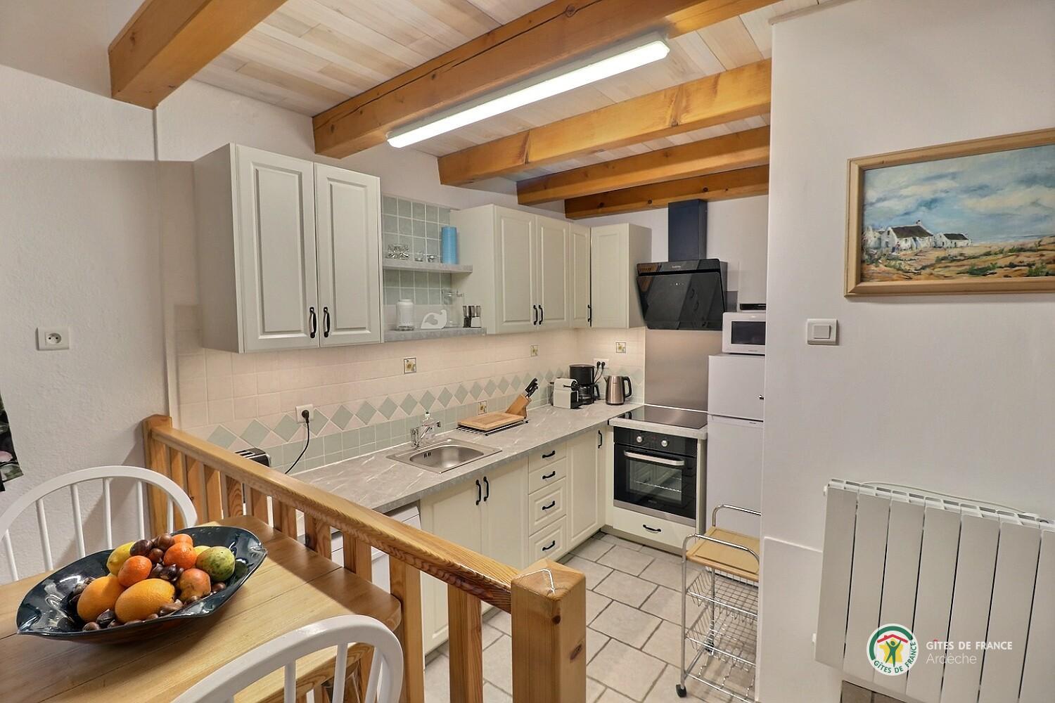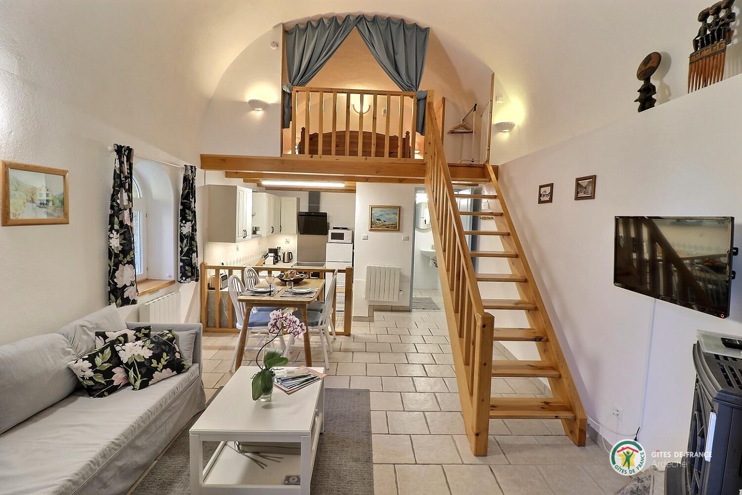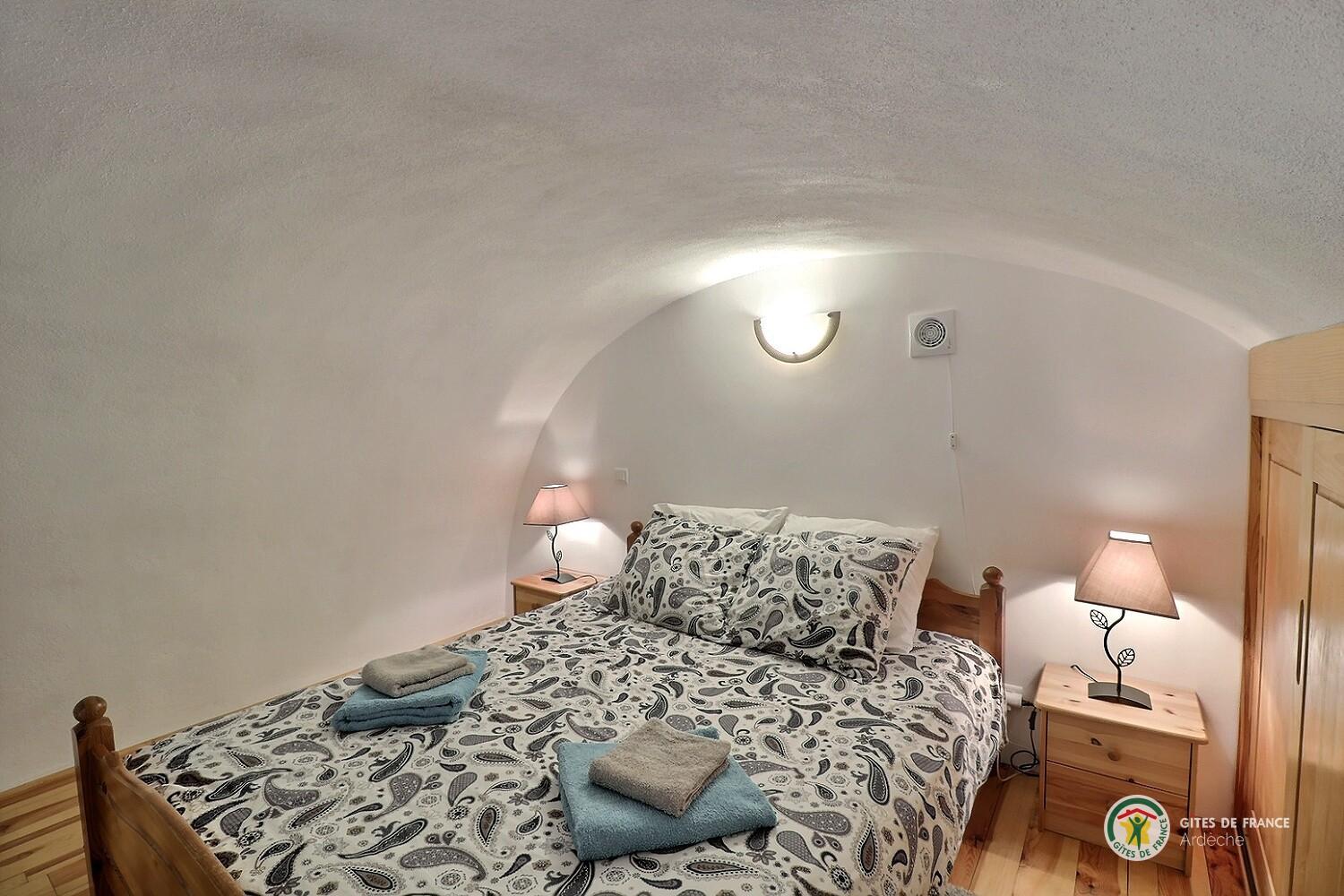 Chaque appartement/gîte dispose de sa propre terrasse, orientée plein sud, ce qui permet de savourer ses repas à la manière de la France méridionale. Une grande piscine est à la disposition des hôtes de la Rastelayre mais rien n’empêche de se baigner et même de nager dans la rivière. De nombreux endroits ensoleillés ou ombragés permettent de se détendre ou de pique-niquer en famille. Avec une surface au sol de 45m², 'La Petite Cave' est un logement confortable pour 2 personnes (4 est possible). Elle a une chambre en mezzanine avec un lit double (160cm x 200cm). Le séjour inclus un canapé-lit se transformant en un lit double. La cuisine américaine est bien équipée et la salle des bains a une douche, wc et lavabo. La terrasse est équipée avec des meubles de jardin, un parasol et un barbecue.